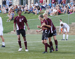 Senior Evan Nesterak (Parker, Colo. / Ponderosa) got the ball rolling with an solid shot that was picked up by Eastern goalie Michael Dorsch (Wilmington, Del. / Wilmington Christian), just a minute before the Garnet picked up their first goal. Sophomore forward Morgan Langley (Honolulu, Hawaii / Iolani School) brought the ball up the field and sent in a cross to teammate Ladule Lako Lo Sarah ’09 (Davis, Calif. / Claremont). At 25:28, Lako Lo Sarah’s shot snuck past the Eastern goalie with ease, marking his third goal of the season to make the score 1-0 in favor of the Garnet.