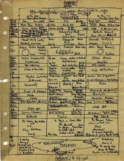 In his seminar entitled "Romanticism from Rousseau to Hitler," Auden assigned his students the works of Kierkegaard, Kafka, Baudelaire, and Melville, among others. As Kenneth Lewars, one of Auden's former students, explains in his article "Auden's Swarthmore Chart" (published in volume 1 of the Connecticut Review), the title of the seminar "was suggestive, not descriptive" - the course focused on "the heterogeneous group of writers who especially interested Auden at the time" (Lewars 45). In much the same way that the professor "assimilat[ed] all of these writers to his own view of the world," Auden prepared the chart below (also transcribed and available as a PDF and reproduced with the permission of the Estate W.H. Auden) for his students, a schematic representation of his ideas and beliefs. From symbols and notions to literary and religious allusions, this chart contains Auden's view of the world (and of worlds beyond), at least as he envisioned it in the 1940s. This unique handout was intended not as Auden's stab at defining the meaning and essence of existence for his students, but rather his attempt at fulfilling "the more private purpose of stimulating thought" among them (Lewars 56).