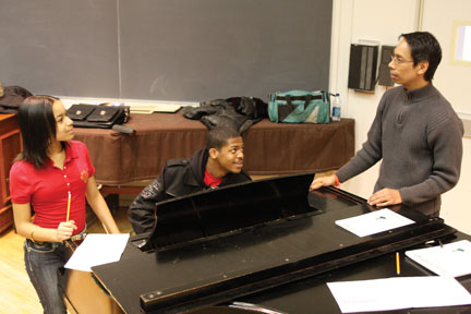 Ja’Quay Lundy and Jabree Reaves are among several chorus members who study music theory after weekly chorus rehearsals. Lundy wrote a school paper about Alston: “[My teacher said, if you had to pick one person in the world that was a hero and an inspiration, who would it be? I picked John. His songs are so beautiful—it’s beautiful how he can share that with the world.”