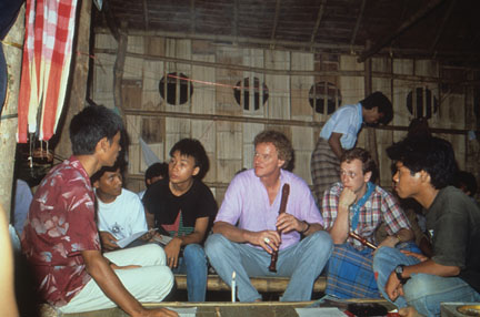 In 1990, Lakey (above, third from right) was smuggled into Burma under the guns of the Burmese dictatorship to assist student freedom fighters, who, although also soldiers, took a course on nonviolent struggle against the dictatorship. Living in the dorm of a “jungle university” that the students had organized within a guerilla encampment in the Burmese jungle, Lakey and his Quaker colleague Michael Beer (second from right) received two meals a day and slept on bamboo mats next to a bomb shelter.