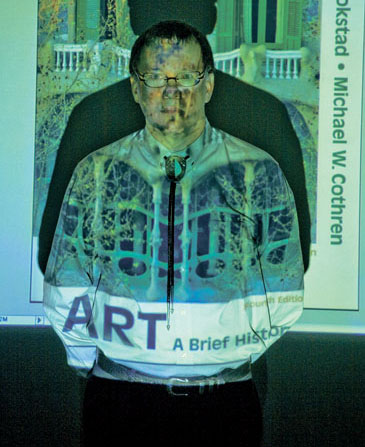 Michael Cothren with the projected image of his latest project—a top-selling art history survey textbook. He wrote in 1995 that it is “irresponsible to introduce students to a contentious discipline through a compact narrative survey.” Both Cothren—and the survey course—have changed since then.