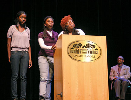 Jacqueline Bailey-Ross (right), founder of the new group Coalition for a Free Haiti, reads her poem “Ayiti” during the Jan. 18 gathering of members of the campus community who assembled in support of the Haitian earthquake victims. Other speakers included Associate Professor of French Micheline Rice-Maximin, a native of Guadaloupe who describes Haiti as her “sister island”; Associate Professor of History and Coordinator of the Black Studies Program Allison Dorsey; and President Rebecca Chopp.