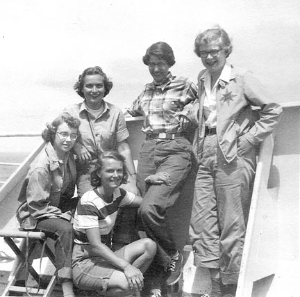 Alzina “Maryal” Stone Dale (far left) and Swarthmore classmates (counterclockwise from front) Jenny (Mary) Lee Suiter, Elspeth Monro Reagan, Nell Goldstein Stern, and Amy Blatchford Hecht on the deck of the Arosa Kulm, a converted troop ship, en route to Europe and the work camps in June 1952.