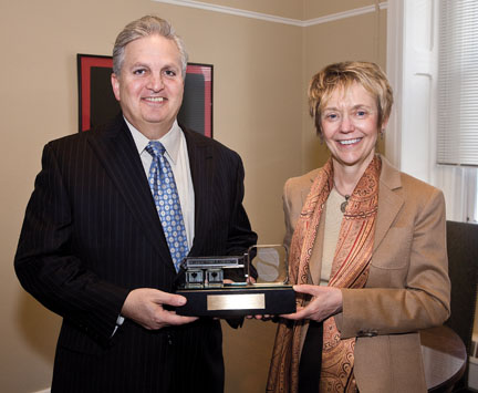 New Swarthmore College President Rebecca Chopp receives a key to Swarthmore borough from its new mayor Richard Lowe.