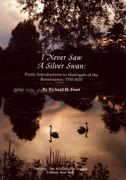 Richard H. Frost ’51, I Never Saw A Silver Swan: Poetic Introductions to Madrigals of the Renaissance, 1530-1630, Tapestry: The All-Centuries Singers, 2009. The author, an emeritus history professor and “bard” for the chamber choral group Tapestry in Clinton, N.Y., has penned an extensive set of introductory poems intended to be read aloud at madrigal performances. These verses serve to maintain variety and interest during madrigal concerts.
