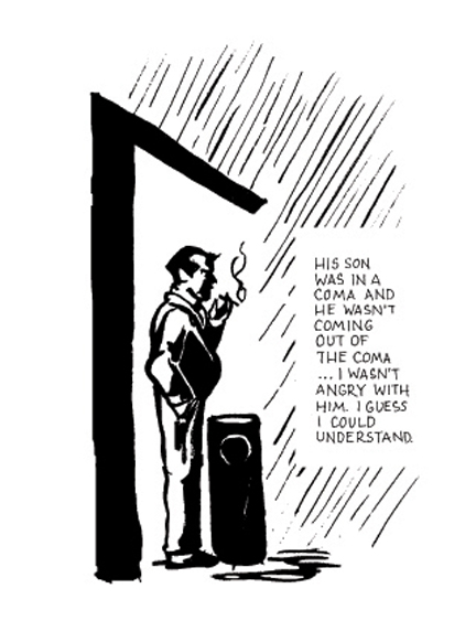 Luke: I kind of knew the situation about his son. His son had been here for a long time and … from what I hear, his son had got into a fight and he was paralyzed. That’s why he got there, and he was in a coma, and he wasn’t coming out of the coma … and I heard how he got that way. He had got into a fight with a black guy and the black guy really, well, you know, because he was here. Well … I went and cleaned his room. His father would stay here every day, all day, but he smoked cigarettes. So, he had went out to smoke a cigarette and after I cleaned the room, he came back up to the room. I ran into him in the hall, and he just freaked out—telling me I didn’t do it. I didn’t clean the room and all this stuff. And at first, I got on the defensive, and I was going to argue with him. But I don’t know. Something caught me and I said, “I’m sorry. I’ll go clean the room.”