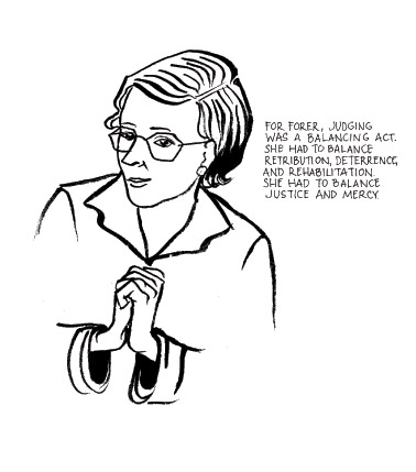 Forer was committed to finding a just punishment for Michael, but there were competing aims—all legitimate ones—that she had to sort out and balance. It was right that Michael receive a punishment that fit the crime and that the community be protected from any danger he might pose. But it was also right that Michael be rehabilitated so that he would not commit another offense upon release. And it was important that Michael’s sentence do minimal harm to his wife and children, and to his chances of being reintegrated into the community. For Lois Forer, judging was a balancing act. She had to balance retribution, deterrence, and rehabilitation. She had to balance justice and mercy.