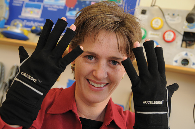 Cori Lathan ’88 demonstrates the AcceleGlove, which allows military personnel in the field to communicate with off-site software using silent hand gestures.