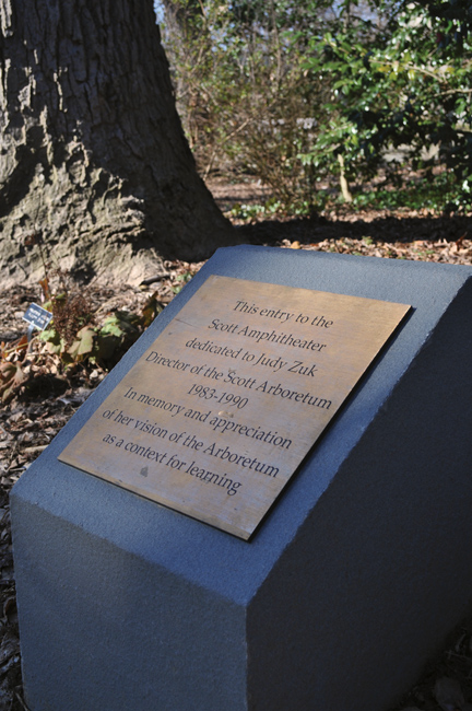 Last year, the late Judith Zuk, director of the Scott Arboretum from 1983 to 1990, was honored posthumously when the east entrance to the Scott Amphitheater was dedicated to her. The entrance is now identified by a plaque bearing her name, followed by the words “In memory and appreciation of her vision of the Arboretum as a context for learning.” Zuk died in 2007.