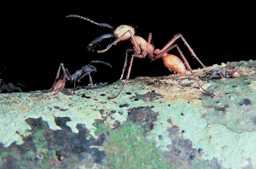 The workers hunt for food in swarms, usually starting at dawn, Rettenmeyer says. “A swarm raid can be about 50 yards wide. It’s quite an intimidating sight. Once you see it, you never forget it.” Ant prey includes cockroaches, wasps, katydids, crickets, scorpions, other ant species, and, on rare occasions, a small vertebrate such as a lizard. The ants dismember larger prey and transport it back to the bivouac. Their mandibles are so strong, he says, that native peoples have been known to use them as natural sutures, pinching off the ant’s thorax and abdomen, leaving the head and jaws to hold a wound closed.