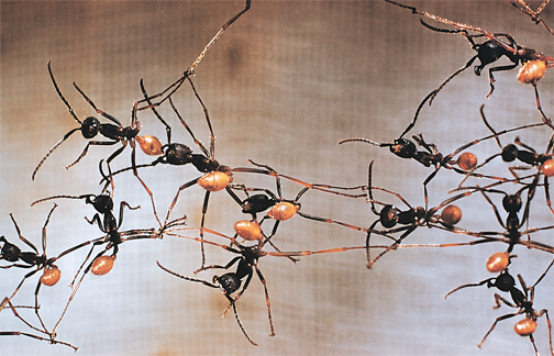 Above: With the ability to support 100 times their own weight, the ants often form living bridges from nest to ground, linking their bodies by means of hooks on their legs.