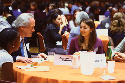 Khadijah White ’04 (left) and David Wright ’69 speak with students about their experiences in journalism at the networking dinner, sponsored by the Alumni Council and the Career Services Office.