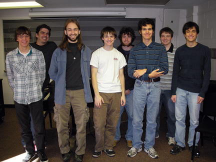 James Matheson ’92 (second from left) led a master class for student composers Niels Verosky ’14, Leland Kusmer ’11, Ben Kapilow ’13, Dan Kurz ’11, Alejandro Sills ’13, Josh Vertolli ’12, and Gabe Riccio ’11.