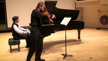 Qian Li ’05 enjoyed revisiting one of his older pieces—“Microtures”—for viola and piano. The works of Martín Carrillo ’97 and Mark Alburger ’79 were featured via video, and David Barnes ’88 submitted an audio recording of his ambient piece “Solitude.” James Matheson ’92, who led a master class for student performers the next day, described his work for six-hand piano “On Spaces,” played by How, Rachel Kolb Moore ’91, and Andrew Hauze ’04.
