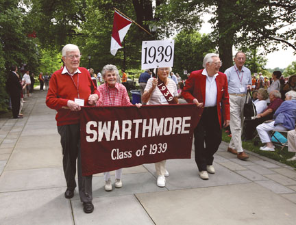 Members of the Class of 1939 lead the annual Parade of Classes to the amphitheater, from left: Edmund Jones ’39, Adalyn Purdy Jones ‘40, Mary Whitford Streit ’39, and Robert Peelle ‘39.