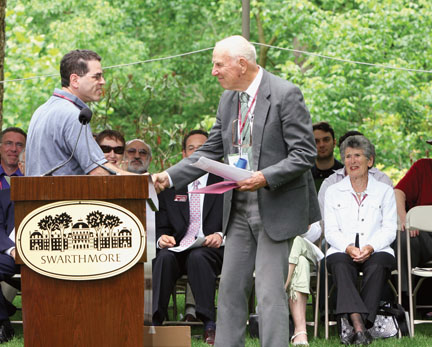 The Class of 1949’s reunion planning chair, Christian “Chris” Pedersen ’49, accepts the Joseph B. Shane Alumni Service Award from Russell Robbins ’84 of the Alumni Council.