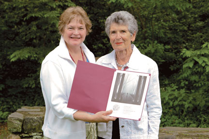 The Class of 1944’s reunion planning chair, Esther Ridpath Delaplaine ’44 (right), accepts the Arabella Carter Community Service Award from Deborah Frazer ’69 of the Alumni Council.