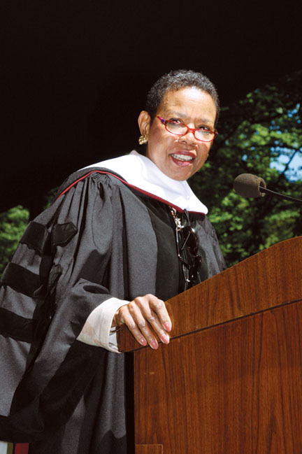Mary Schmidt Campbell ’69, (watch: speech) dean of the Tisch School of the Arts at New York University, spoke of her graduation from Swarthmore at a time of radical global, social, and cultural revision. She spoke of her anger and disappointment at what she saw at the time as a breakdown of the College’s effort to create an integrated campus. Despite a vow back then never to return to the College, she spoke of the powerful lessons she learned through her reconnection to Swarthmore.