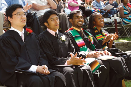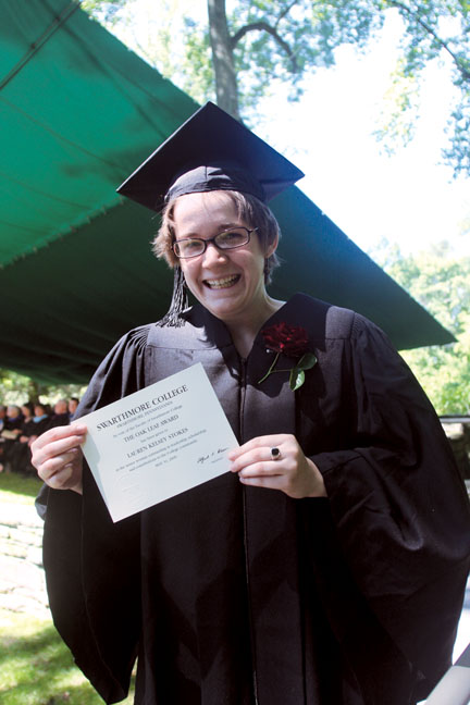 At 9 a.m., on May 31, the day of Swarthmore’s 137th Commencement, the sky was a uniform gray. Relatives and friends of graduates, waiting in line by the Field House for the golf-cart “taxi service” to the Scott Amphitheater, looked up anxiously. At the first few drops of rain, umbrellas, held at the ready, shot up to protect the fancy dresses, smart suits, and other graduation garb. Loaded golf carts ran busily back and forth, carrying the excited visitors who were determined not to let weather deter them from the race to the amphitheater—and that special seat with the best view of the stage where their offspring would pass from Swarthmore to the world beyond. So busy were they that almost nobody noticed the skinny sliver of blue lurking on the western horizon, as if in the wings, waiting for its moment. Edging eastward, the sliver became a band, expanding, preening, puffing out, jostling the clouds, knocking them this way and that, bursting onto the scene as an azure ceiling, adorned by a warming sun, high above the crowd—the beginning of a a perfect day.