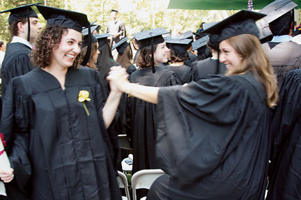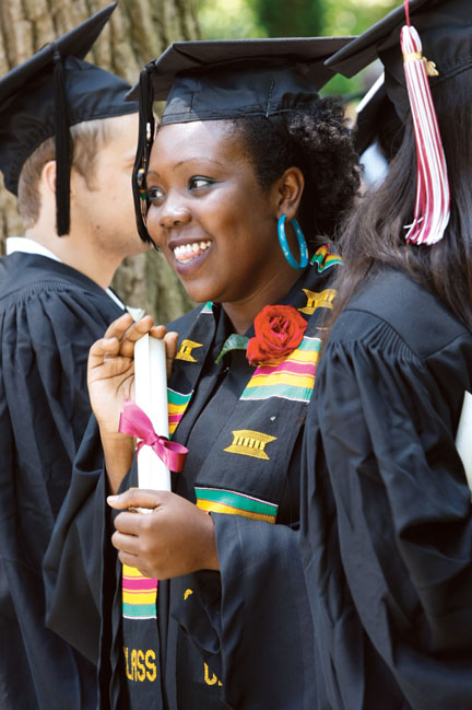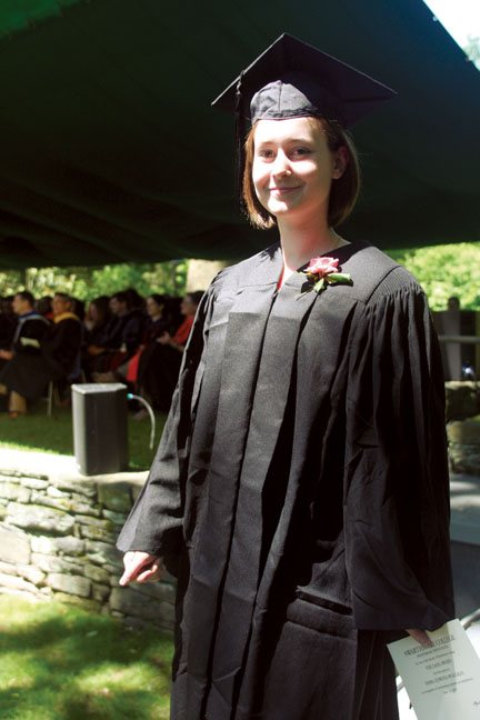 To a soaring trumpet solo of Paul McCartney’s “Let It Be”—arranged by Associate Professor of Music John Alston—the robed procession curled its way into an amphitheater so full that some audience members stood pressed into the shrubs, with mountain laurel or rhododendron blossoms caressing their hair. Some high-spirited faculty members wore not only their academic dress but an array of headgear that competed in creativity with the graduates’ adorned mortarboards. Roses were brilliant against dark gowns. Faces shone.