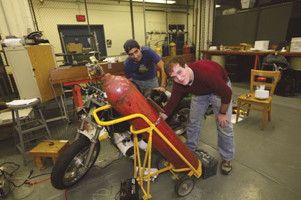 For two years, Andres Pacheco ’09 (left) and Alex Bell ’09 spent hours thinking about, tinkering with, and testing their senior design project—a hydrogen– fuel-cell powered motorcycle. Only one other vehicle like it exists—in London.