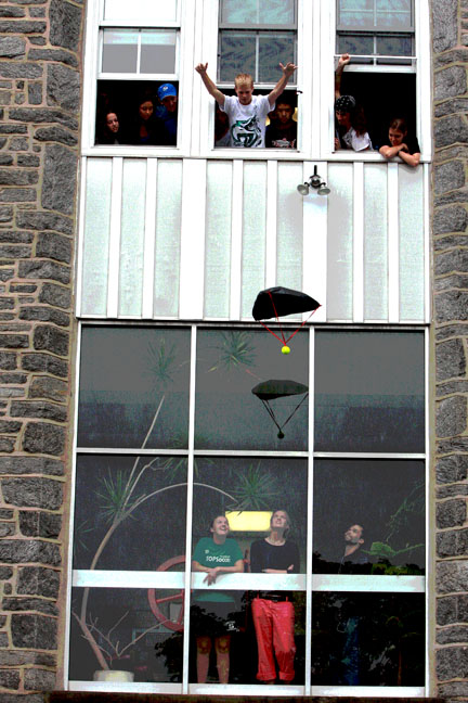 INTERPRETING THE RULES: Using a tennis ball, three dowel rods, a plastic trash bag, a roll of electrical tape, a paper clip, and three rubber bands, teams of freshmen in Professor Erik Cheever’s Engineering Methodology course designed and built devices aimed at keeping the tennis ball from reaching the ground for as long as possible after being dropped from a Hicks Hall window. This team built a parachute, but the winners triumphed with what Cheever described as “the most unique interpretation of the rules.”