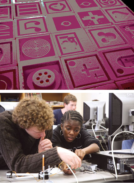 COMPUTERIZED DESIGN: Most E5 projects require the use of Solidworks, software that enables students to create, for example, patterns that are transferred via a milling machine onto pieces of Styrofoam (top), or program robot arms to perform writing or drawing tasks (bottom). To facilitate collaboration, their professor set up a Wiki site where students share information.