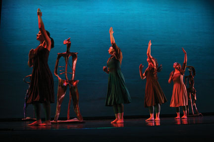This year’s concert opened with the work Solas an Lae (which means “daylight” in Gaelic), choreographed by Sharon Friedler, Stephen Lang Professor of Dance and director of the Dance Program. Friedler says she was inspired by personal impressions of light, shadow, wind, and waves along the coast of Northern Ireland that were reinforced by conversations with Managing Director of the Lang Performing Arts James Murphy, who had also visited the region. Landscape paintings of the area by Professor of Studio Art Randall Exon evoked further memories of the unusual interplay of light and landscape observed by Friedler and Murphy. At various stages of the piece’s creation, Friedler had listened to the music of harpist Johanna Bond ’10 and envisioned an essential role for the harp in the piece. She also incorporated sculptures by Phillip Stern ’84—whose hybrid figurative forms include combinations of human and harp shapes—into the stage setting.