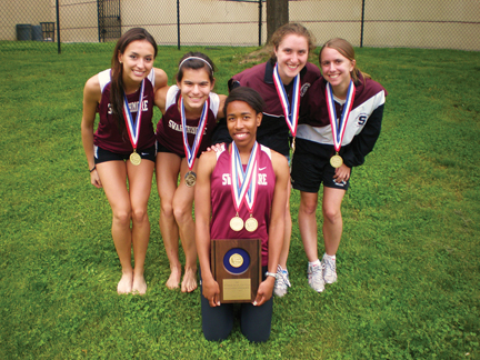 Centennial Conference medalists for the womens’ track team (from left) Stephanie Beebe ’12, Rebecca Hammond ’13, Kenyetta Givans ’12, Hannah Rose ’12, and Katie Gonzalez ’12.