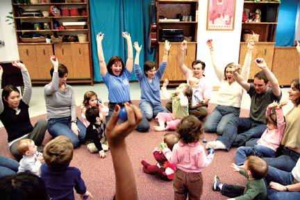Nonstop movement and giggles set the tone at Georgia O’Brien’s Music Together class in Traverse City, Mich. After a welcome song, “Hello Everybody, so glad to see you …, ” she launches into “My ball is big and blue; I’m rolling it right to you….” One song slides seamlessly into the next. Silliness rules. Georgia taps rhythm sticks on the floor to a wordless “bum bum” tune, then waggles them on her head like antenna, singing “bzz bzz buzz.” When she dumps out an enormous basket of instruments, the kids leap up as if it’s candy. Tanner, a jowly-cheeked toddler, beats a tambourine. Jacob, 5, clanks a “clatterpiller.” Moms and dads join in, striking triangles and clapping frog-shaped castanets.