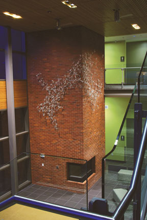 Abigail Donovan ’92 completed a large-scale permanent sculptural installation for the University of Oregon’s new HEDCO College of Education building. A public commission for the state of Oregon, the piece is titled The Cloud of Disquiet: Stanza Second.