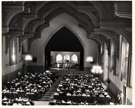 By 1933, these assemblies took place at 9 a.m., Monday through Friday. A “Collection” was held every Wednesday in Clothier Memorial Hall. This 15-minute meeting, at which student attendance was required,