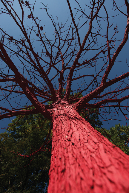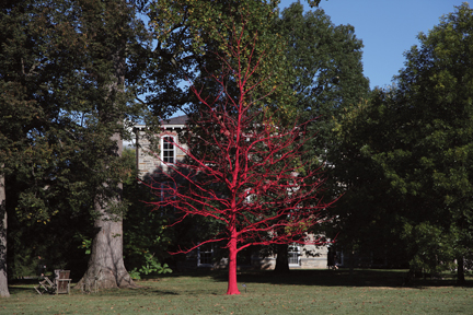 The bright red tree is the most recent addition to a Scott Arboretum project that uses dead or dying trees as art objects. In 2006, a Chinese maackia tree suffocating from construction compaction was painted blue by an arboretum curatorial intern.