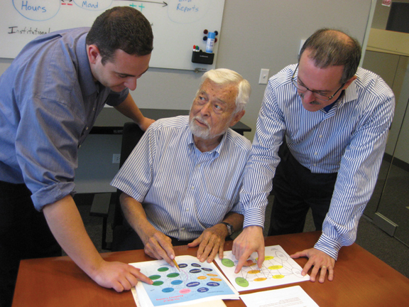 Baldwin, center, confers with members of his research team on a structural equation model of the resident working-and-learning environment.