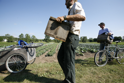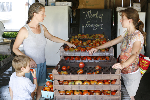 It’s August and tomato season at Essex Farm. On Fridays (“Distribution Day”), members of the community-supported farm can take as much food as they want for the coming week. Members pay one price annually but have no fixed share—and Essex supplies a complete healthy and satisfying diet: beef, chicken, pork, eggs, maple syrup, grains, flours, dried beans, herbs, fruits, and 40 different vegetables. “We get to see what people take, and we can adjust what we’re growing. It’s a self-correcting system,” says Mark Kimball.