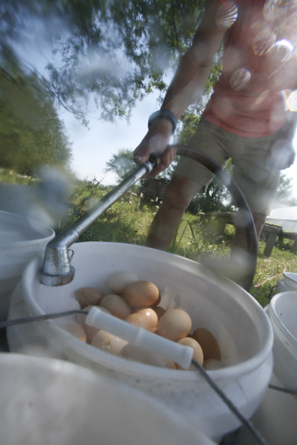 Kristin Kimball works at a table in the shade, washing eggs, and a steady stream of members wander back to see her, to chat. One would like a book signed for his sister. Another asks about a barter—family portraits for food? Several offer to come and help with the haying, and each offer is gratefully accepted.