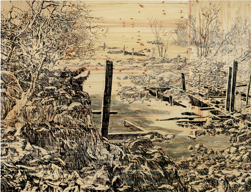 Remnant, 2008 (above), one of the exhibited works, is an ink drawing on carved wood panels, 103 x 141.7 inches.