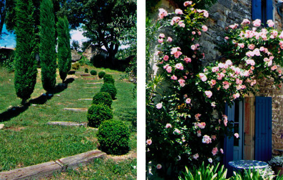 À l’ouest, une grille sépare un jardin carré bordé de cistes, santolines et romarin du champ de lavandes. C’est le début de la floraison. Au centre, un figuier, sa petite bordure de buis taillé. Chemin et marches de bois (anciennes traverses de chemin de fer) descendent de la maison vers la piscine. Sur la terrasse Au printemps, la terrasse est couverte de rosiers en fleurs. Ce rosier ancien entoure la porte de ma chambre. Sur la terrasse de nombreux pots de fleurs bleues et blanches qui fleurissent tout l’été : agapanthes, plumbagos, Scaevola (du nom du général romain qui, ayant annoncé imprudemment qu’il se couperait un bras s’il perdait une bataille, fut obligé de s’exécuter).