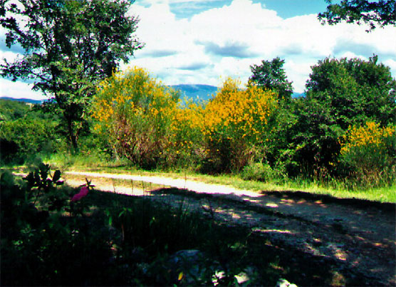 Ce chemin qui conduit à ma maison depuis la route environ 500 mètres plus bas, est réservé à moi seule. En ce moment les genêts sont en fleurs et embaument. Élan de joie lorsque j’emprunte ce chemin et que je découvre la maison dissimulée par une haie de vieux cyprès provençaux.