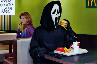 Fatiha Toumi m’envoie la photographie d’une publicité de McDo vue cet été dans les villes de la côte d’azur. Un fantôme qui ressemble à Scream et à une femme en jilbab. Quick hallal… Cynisme ? Provocation ? Humour ?