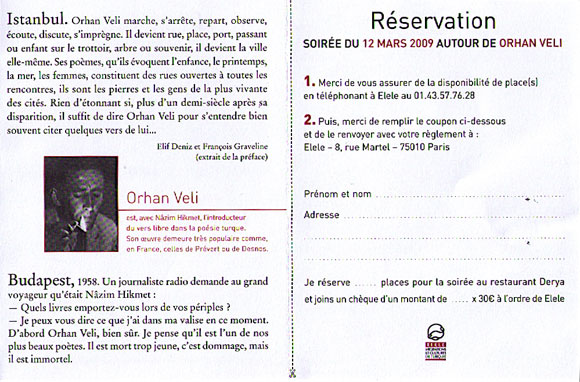 Passé le boulevard Saint-Denis, la rue est turque, restaurants, supérettes, marchés de fruits et légumes ? Kebab (il y en a dans toute la France). Les Éditions Bleu autour, amoureuses de la Turquie depuis l’enfance, présentent dans une belle salle de Derya avec l’association Elele, et dans le cadre du XIe Printemps des Poètes, des poèmes de Orhan Veli (1914-1950), poésie en vers libres, savante et populaire : Orhan Veli, Va jusqu’où tu pourras, traduction et présentation de Elif Deniz et François Graveline, postface de Enis Batur, dessins à la plume de Sébastien Pignon, dessins au fusain de Eloi Valat.