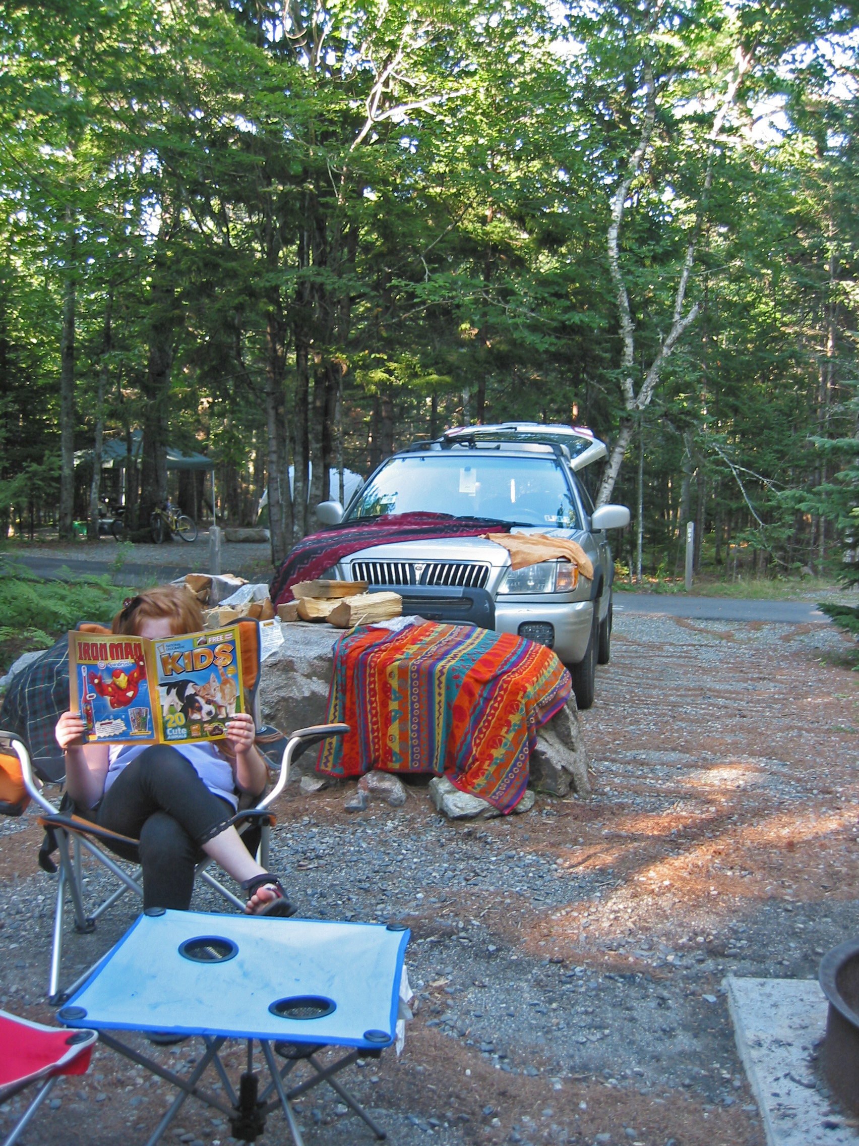 Back from our big summer camping trip, this time in Acadia National Park. Fun, but there was a bit of a curse on this particular expedition. First the valve on our mattress broke and we slept on the hard and pointy rocks that make up the campsites at Blackwoods. (I ended up coveting the soft moss around each campsite as a result.) On childhood backpacking trips, I was used to sleeping on bedrolls, but I have to admit that I’ve gotten accustomed to inflatable mattresses in the years since. We picked up a cheap replacement and duct-taped its also-leaking valve shut.