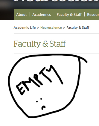 Still a default to big pictures and words. The superficial admissions-brochure description of neuroscience actually requires me to scroll down at the default display size to even read the whole thing, and the pictures are utterly banal images of happy students, nothing to do with the department, program or whatever. When I click on Faculty and Staff in the mid-page banner, here’s what I get: