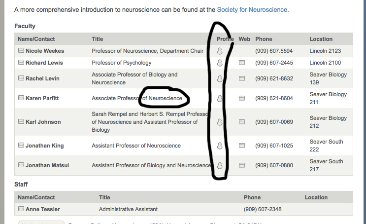 Let’s try two more quickly. How about Pomona? As with Williams, it’s three links deep to the listing of departments. (That Google search is looking better and better all the time.) When you arrive at Neuroscience, you find it’s a bit difficult to tell: is it a department? a program? The language seems to imply it’s a department. Some faculty are listed as “Professor of Neuroscience”, a suggestion that their tenure line is in Neuroscience, not something else. But, if you can navigate the somewhat confusing faculty guide embedded in the department’s webpage to look at faculty profiles (click on the little chess piece icons),