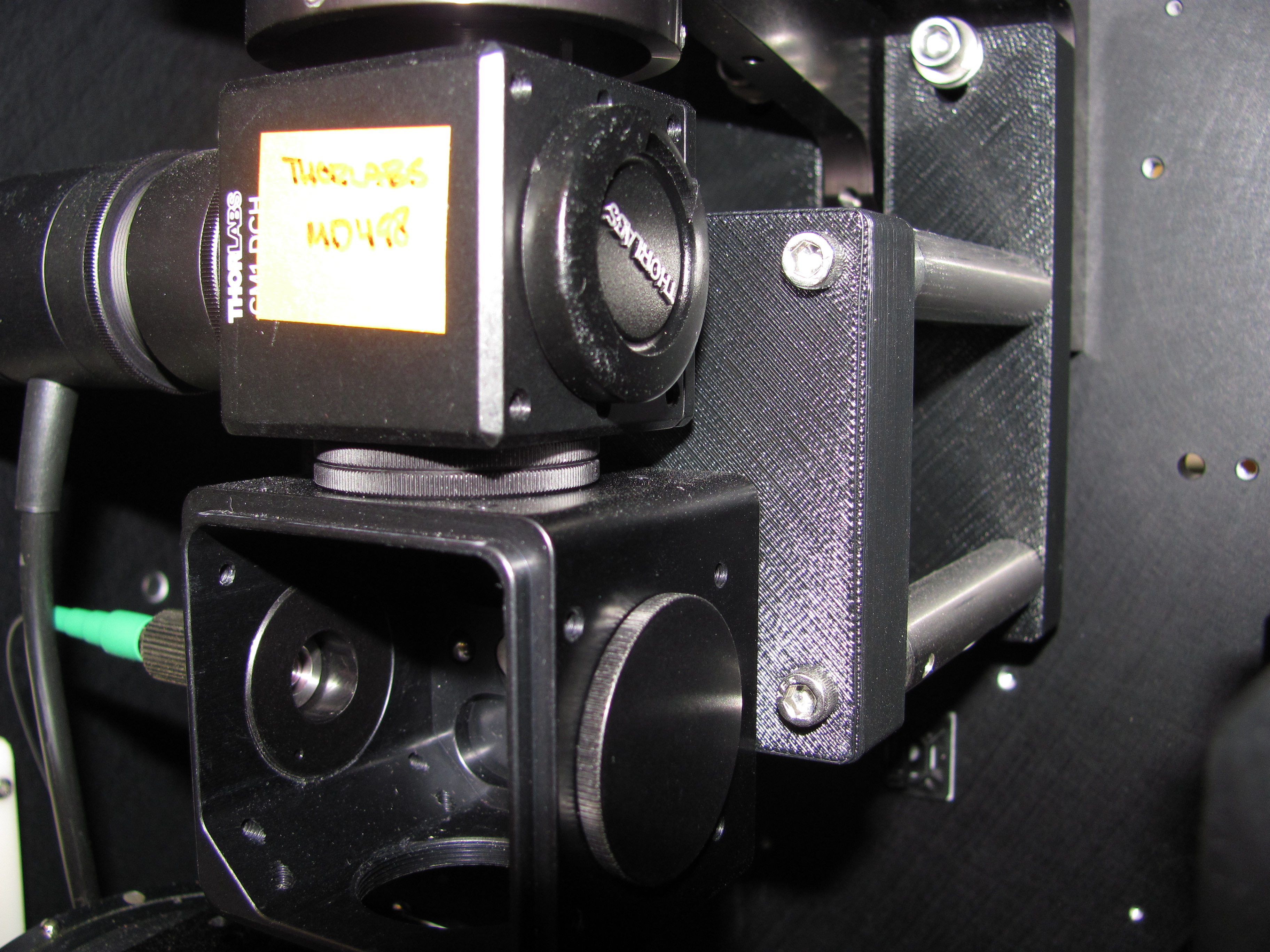 The back plate bolts on top of the bracket which supports the tube lens. The front plate is connected to the back plate using 3″ long 1/2″ optical posts (TR3). The filter cubes then attach to the front plate. The CM1-DCH cubes are 0.03″ taller (to the center of the filter) than the DFM cubes so if using DFM cubes three 0.01″ shims are required. That is all there is to adding your own optics to the imaging core.