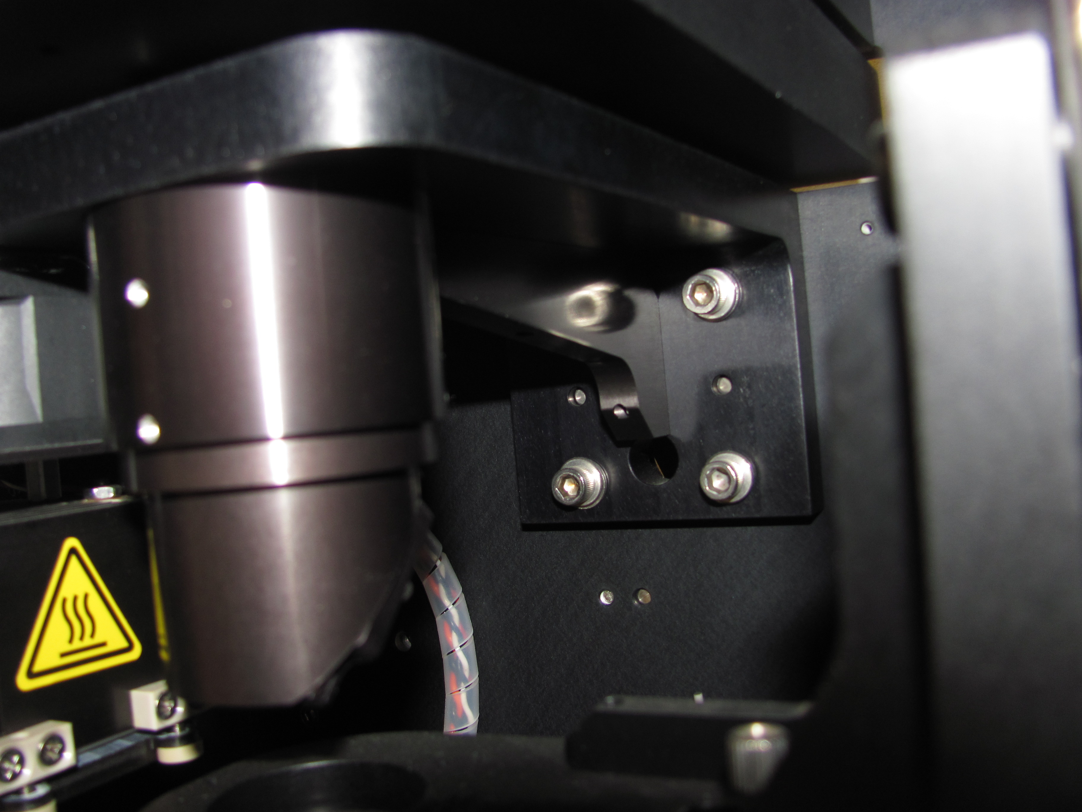 We wanted to use a high power LED as a fluorescence light source and an IR laser as a way of heating cells in the RootScope II. To do this we removed the dichroic and designed a mount which allows us to use Thorlabs filter cubes (CM1-DCH and DFM – others should work too) to replace the original dichroic without altering the rest of the optical train.