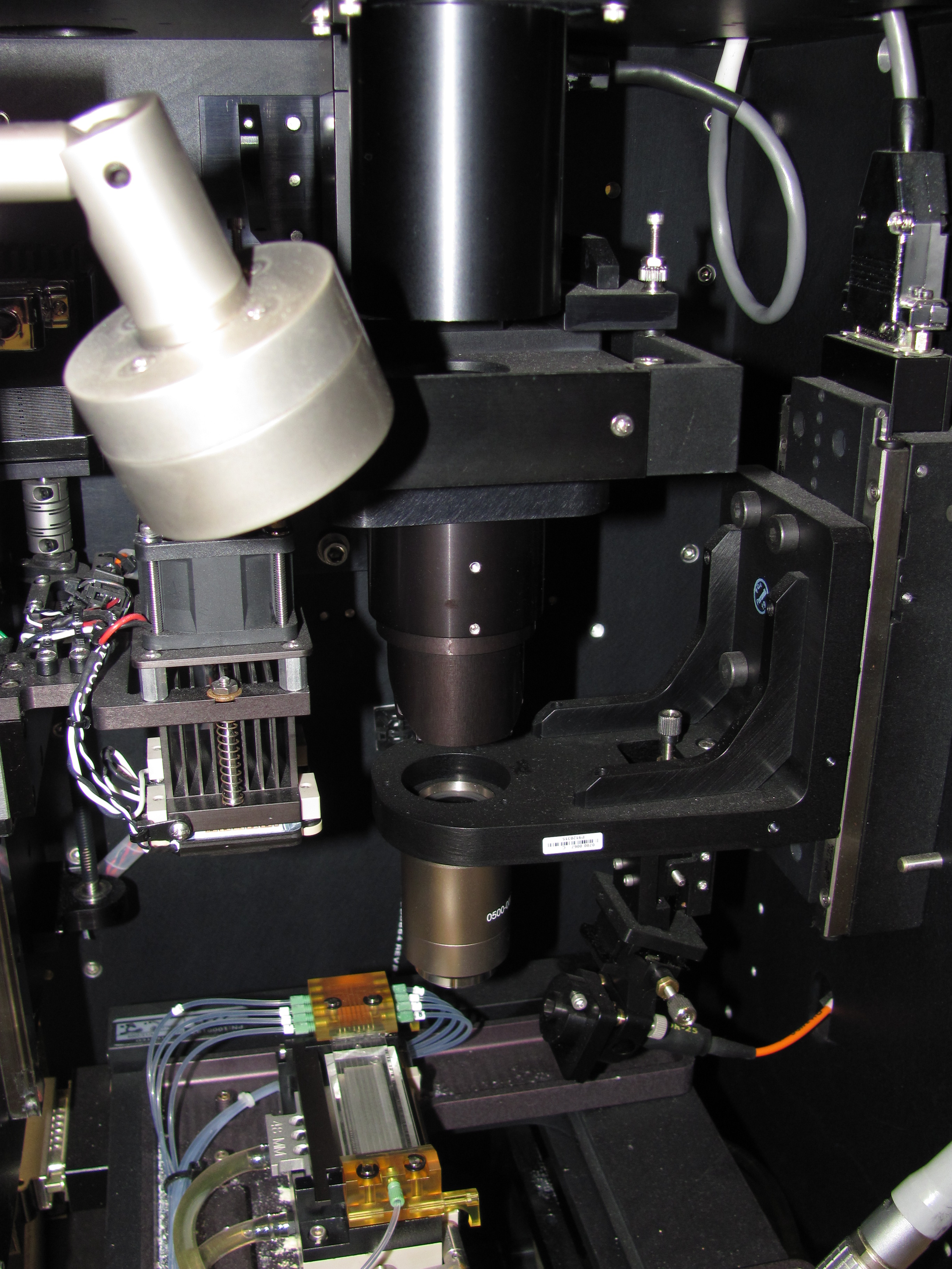 The imaging core from the GAIIx has a dichroic for the focusing laser mounted above the objective and below the tube lens and filter wheel in the infinity space of the microscope. The laser comes in from the back of the crate (hole at the back in the second image) and hits the dichroic (diagonally mounted at the bottom of the cylinder).