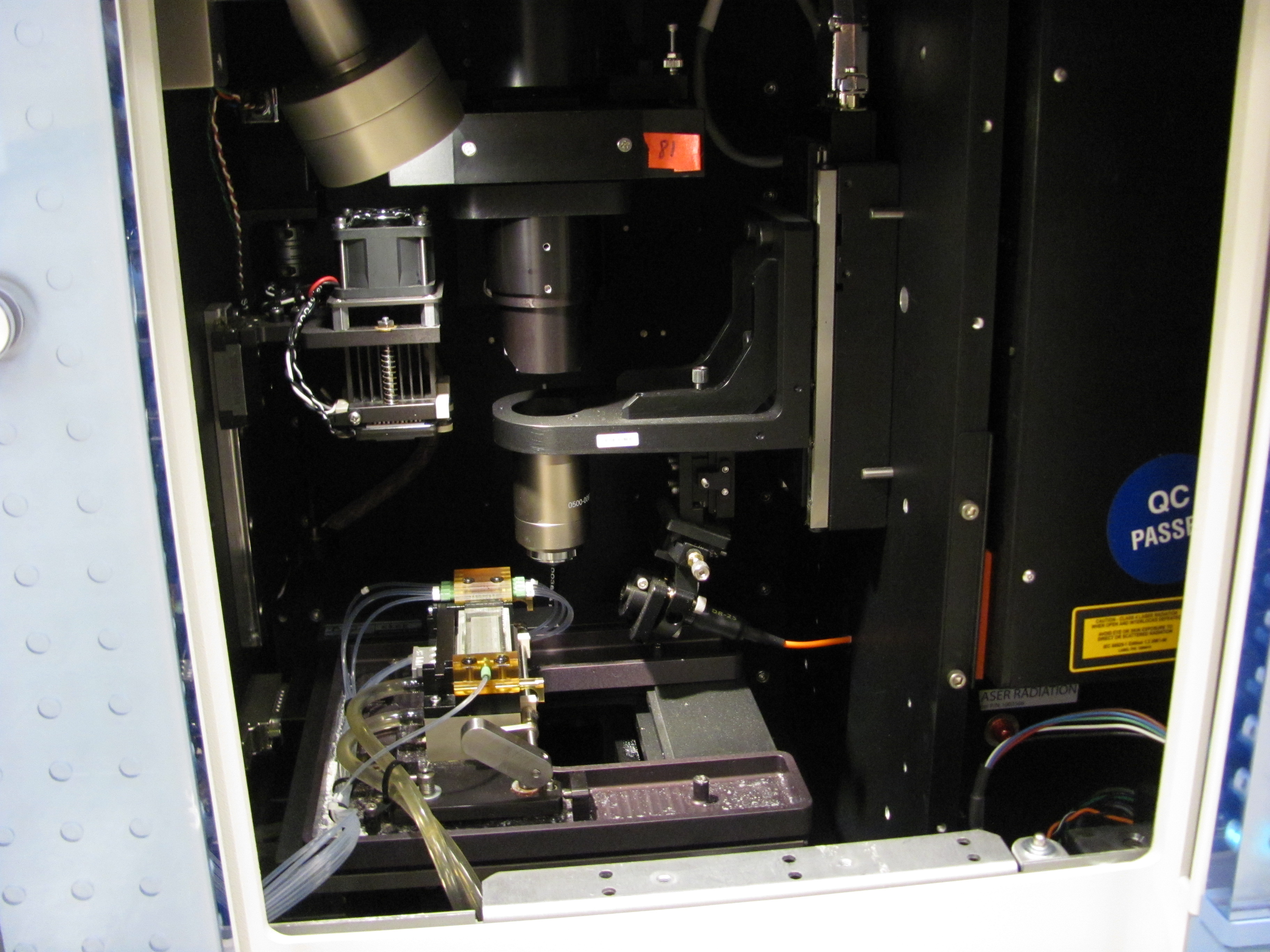 The GAIIx consists of a fully automated TIRF microscope, some fluidics, and temperature control hardware. Let’s start by considering the imaging core which can be seen behind the sliding door on the right side of the instrument.