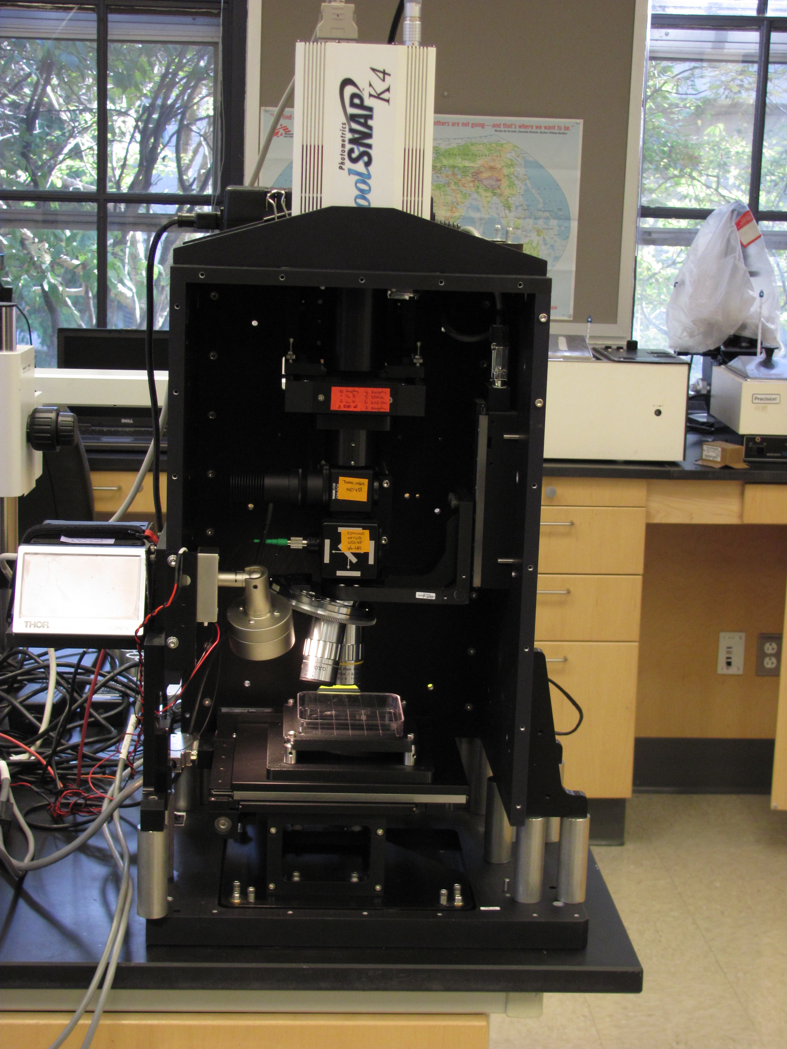 Next comes an ASI FW-1000 filter wheel (8 position, accepts 25mm filters. It is labeled with red tape and the number 81 in the picture) and completing the microscope and not visible in this picture (see below) is a Photometrics Coolsnap K4 camera. To use the camera you will need the PCI card (01-490-00x) from the computer that came with the sequencer and the LVDS data cable (37-071-001 ) which connected the sequencer to the computer. These can be found separately on Ebay or bought directly from Photometrics.