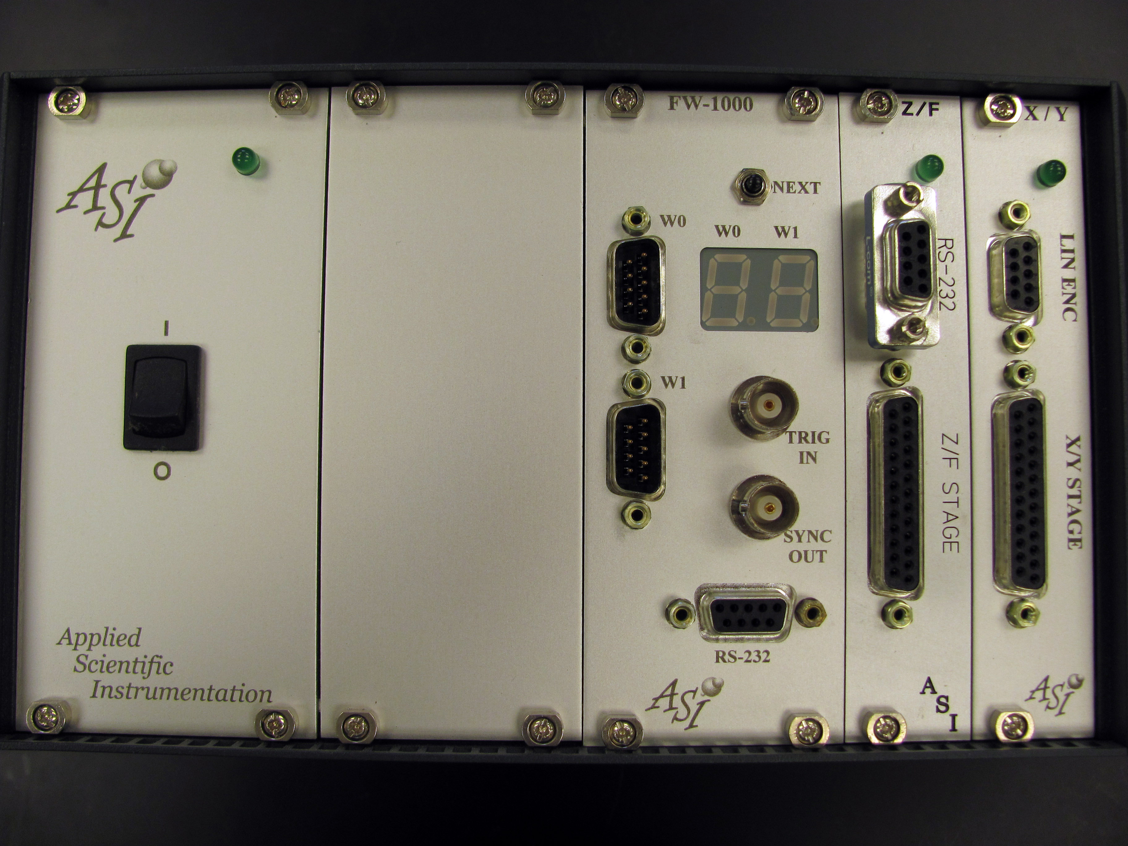 Connecting the LS-4000 is straight forward. The connection to the computer is a standard serial connection which plugs into the port labeled RS-232 on the Z/F card (not the FW-1000 card). The filter wheel connects to W0 or W1 on the FW-1000 card, the linear (Z) stage connects to the Z/F stage connector on the Z/F card, and the XY stage connects to the X/Y stage connector on the X/Y card. As far as I can tell, the linear encoder connection on the X/Y card was used to monitor whether the sliding door on the front of the GAIIx was open or closed.